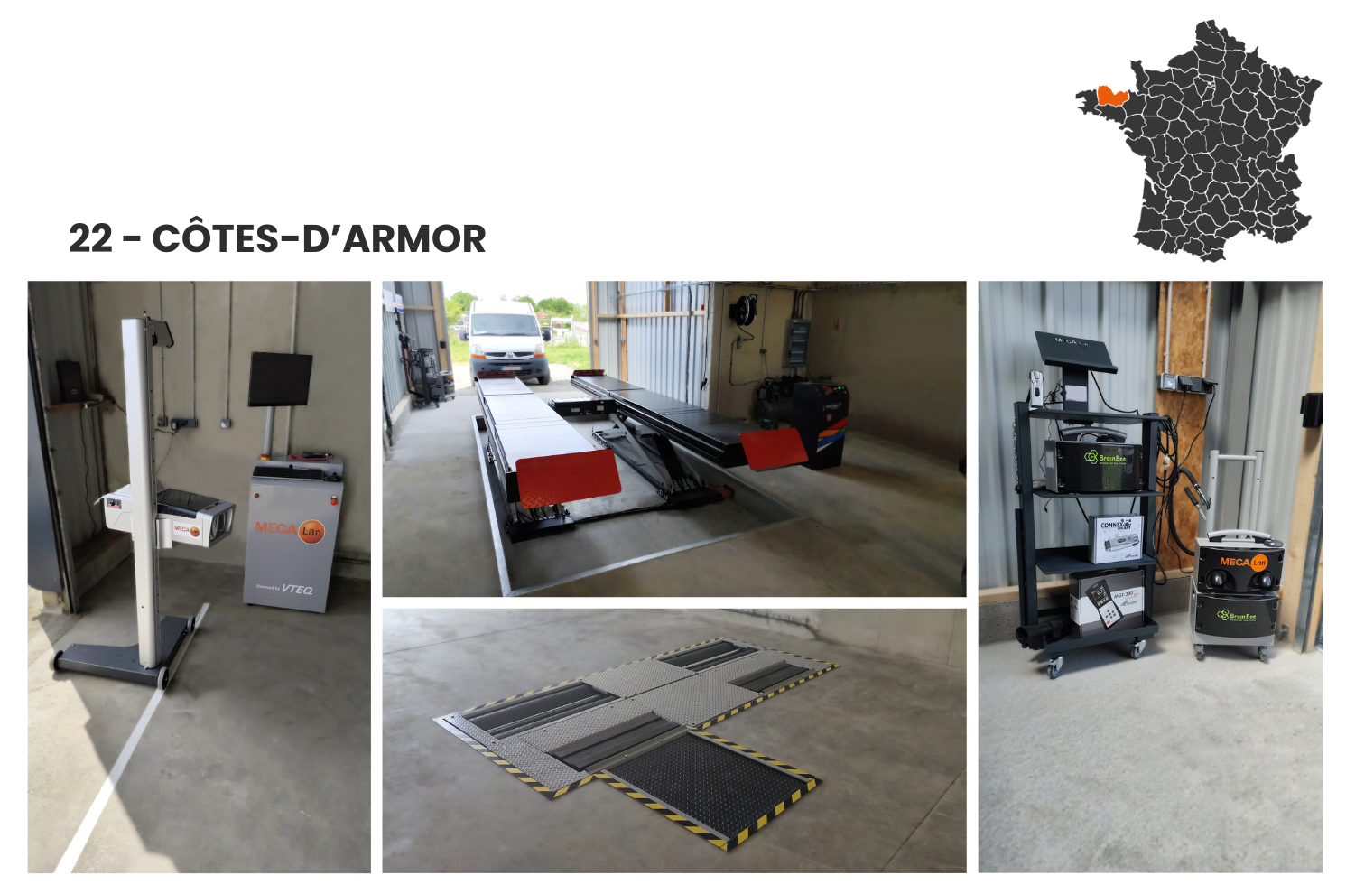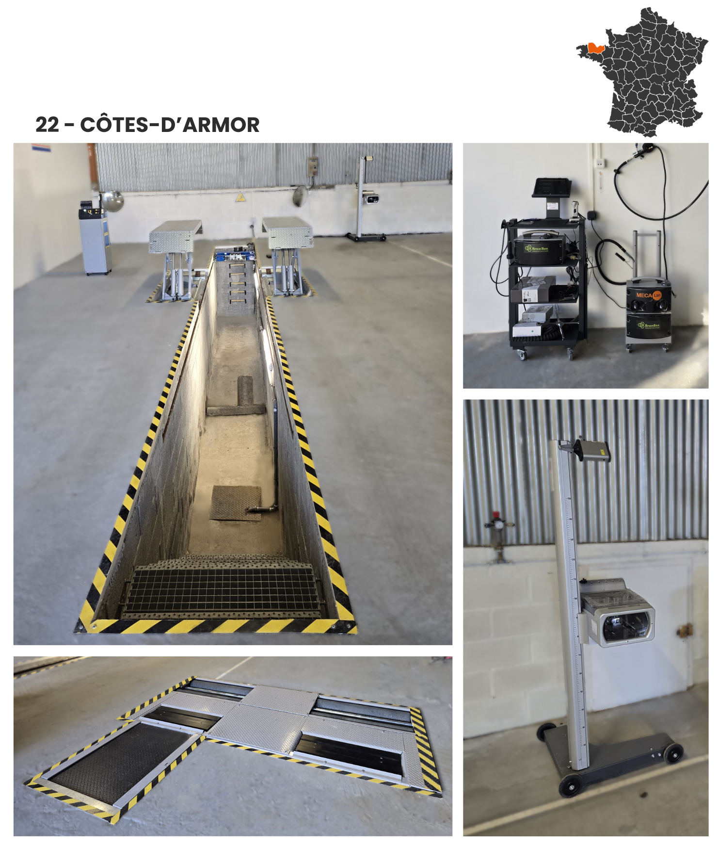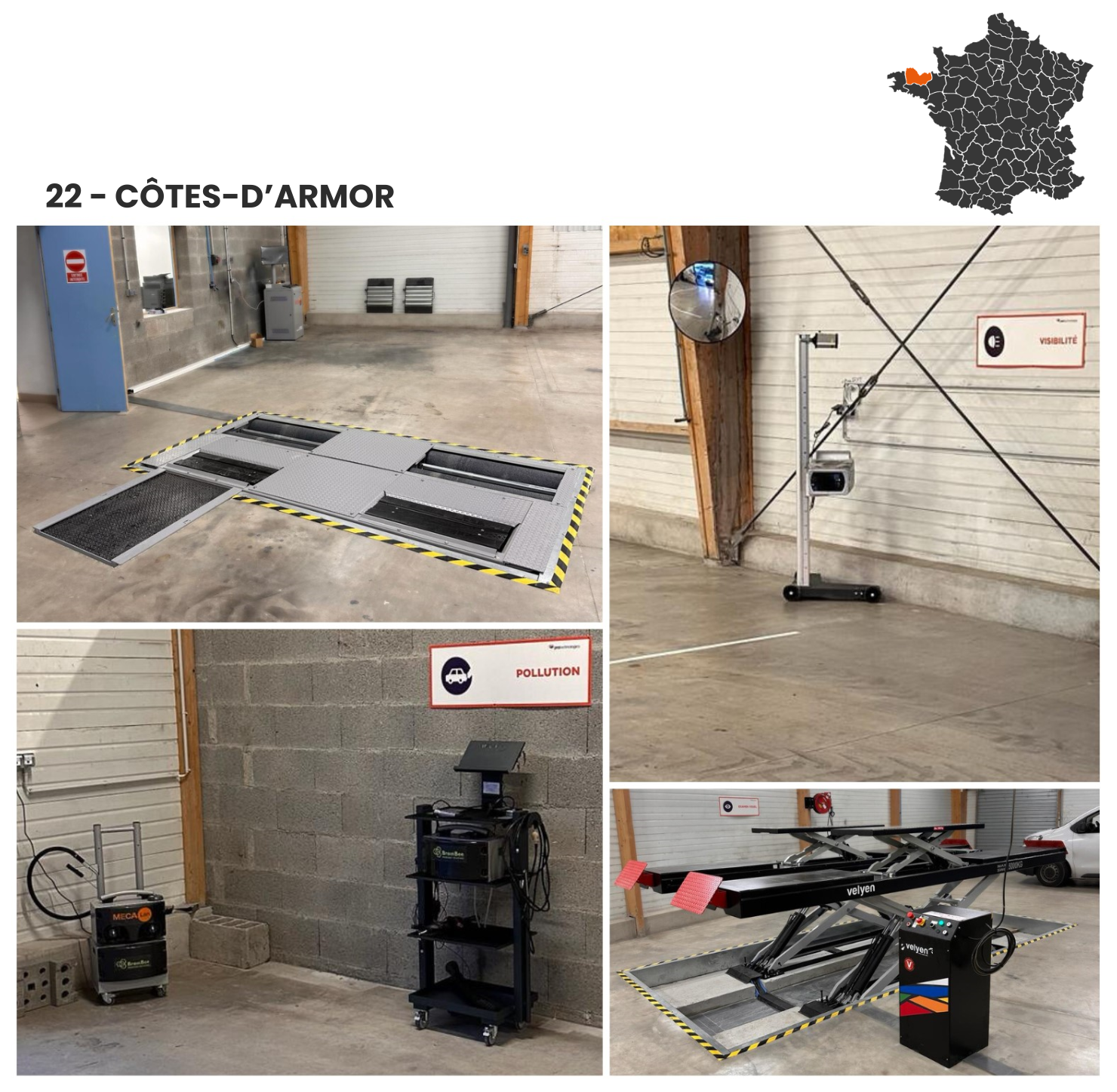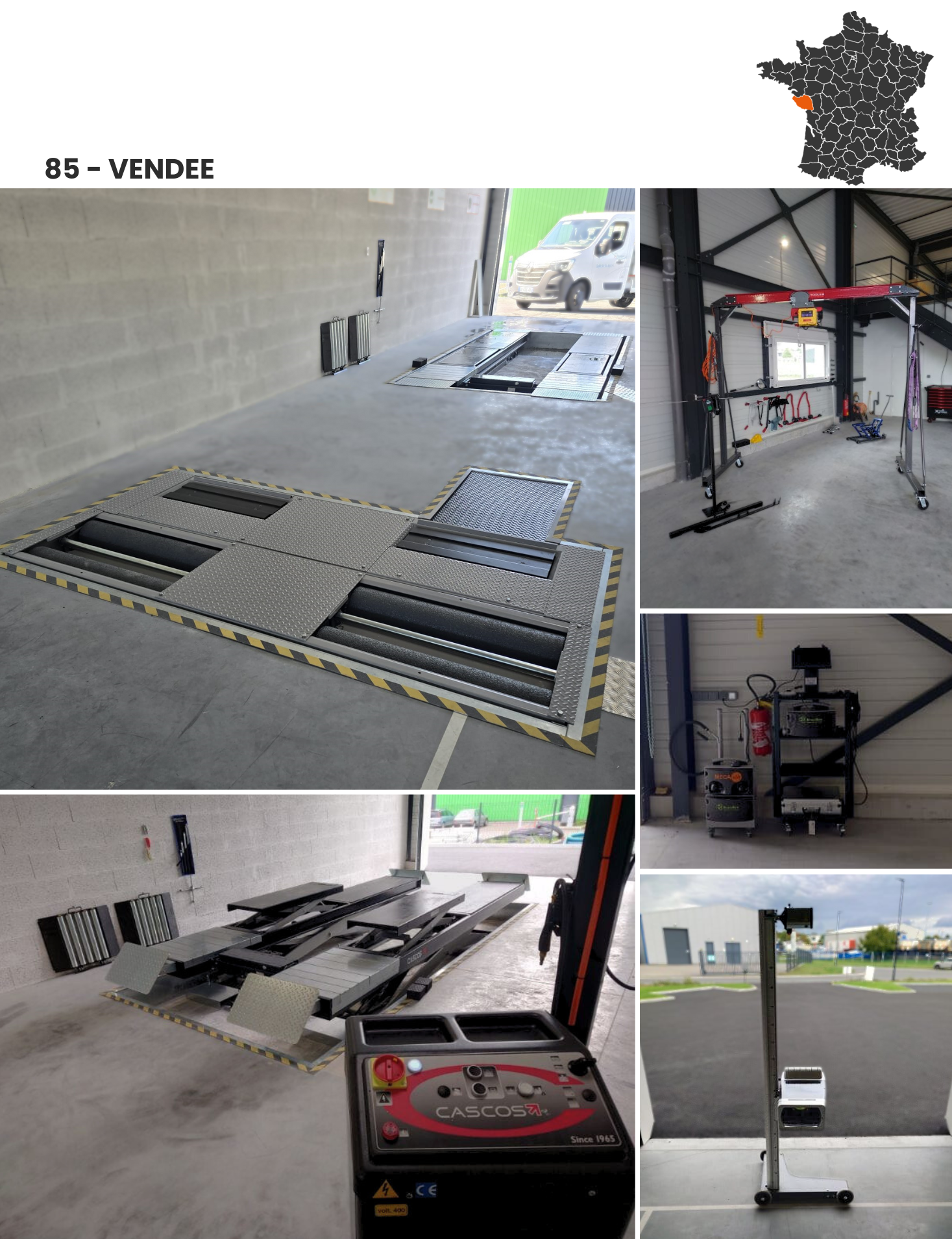 Plaque de ripage, banc de suspension, banc de freinage, opacimètre, analyseur de gaz, réglophare, pont élévateur, traverse de levage, plaque à jeux, extracteur de gaz...